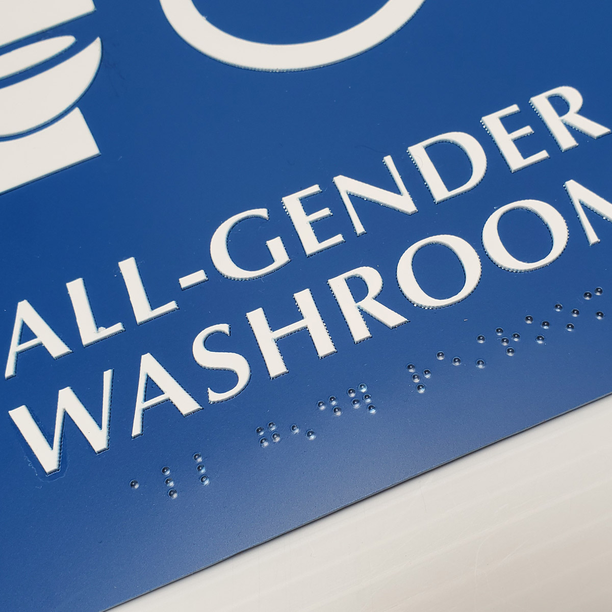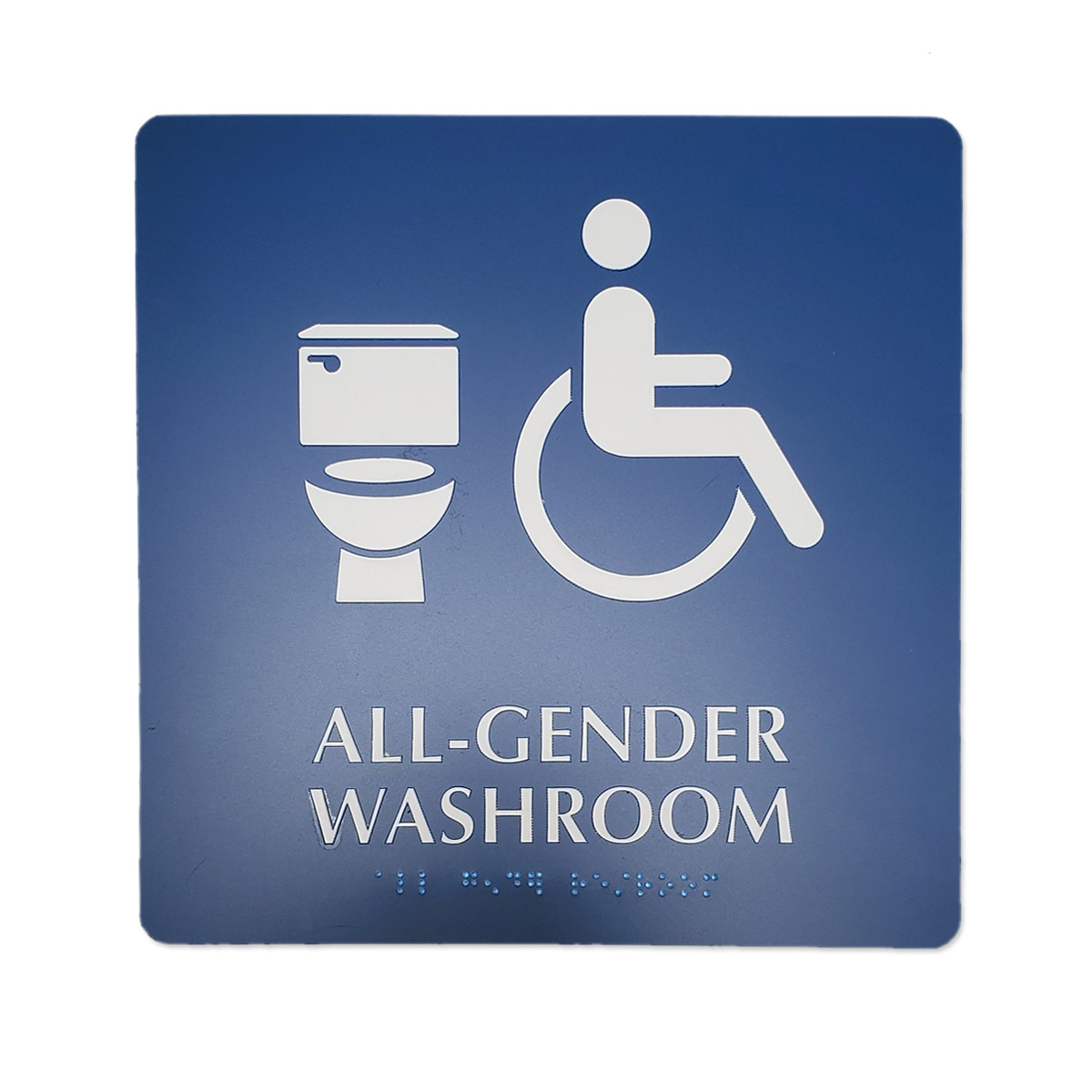 Washroom sign for all gender washroom facilities, reads “All-Gender Washroom” and contains graphics for washroom and handicap accessibility.
