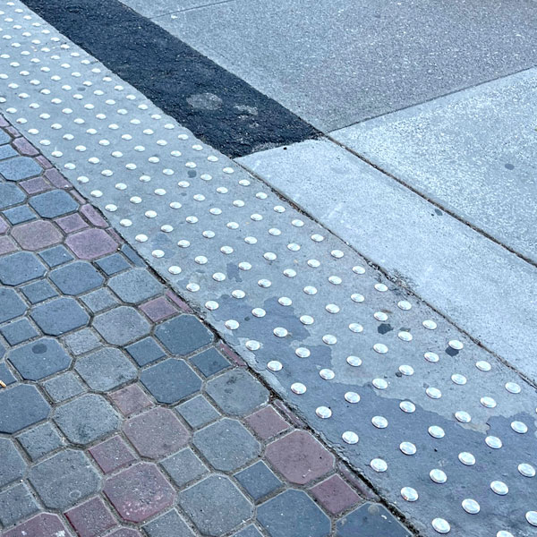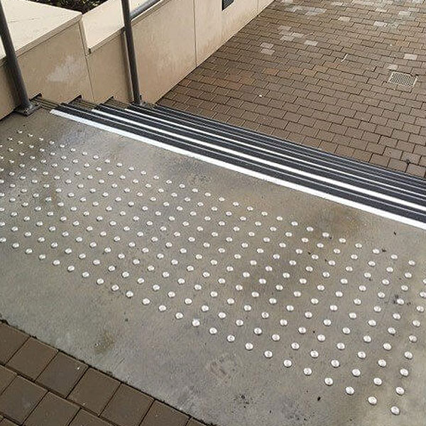 Tactile Indicators have 2 uses. They are primarily installed on landings at the top of stairs or before sloping sidewalks to warn seeing impaired people of the upcoming elevation change.